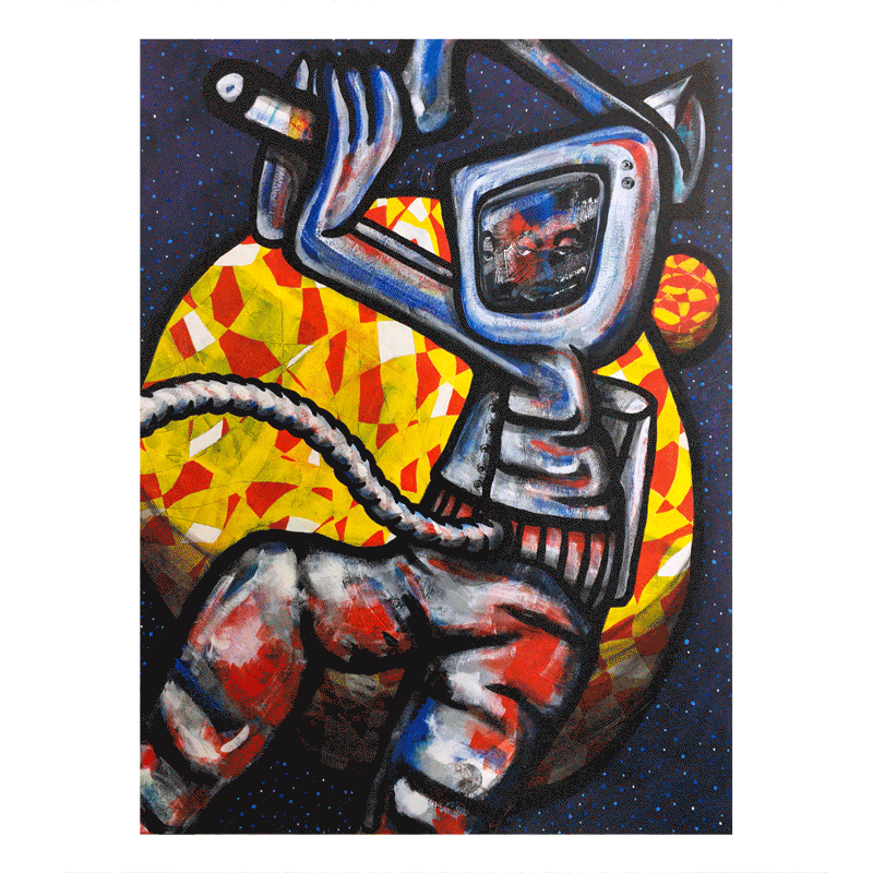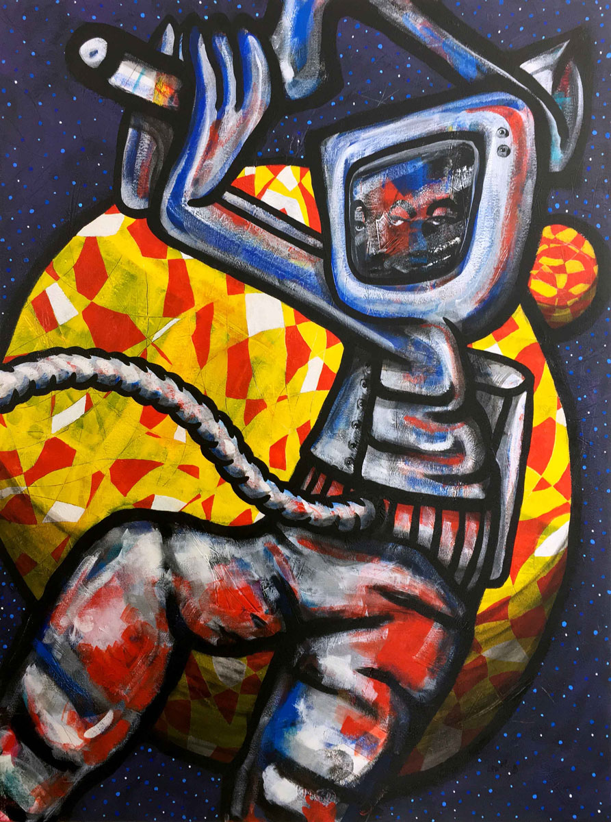 L’Astronaute marteleur est un défricheur d’univers parallèles. Il bondit d’une planète à l’autre, martelant les espaces de verre pour y ouvrir de nouveaux horizons.